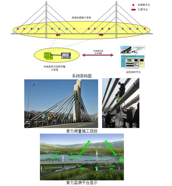 大型桥梁结构健康监测系统采用无线传感器网络监测模式来构建无线、分布式桥梁结构健康监测系统,进行索力、倾角、温湿度、振动等桥梁参数的实时监测,实现结构监测的智能化、实时化、自动化和网络化。